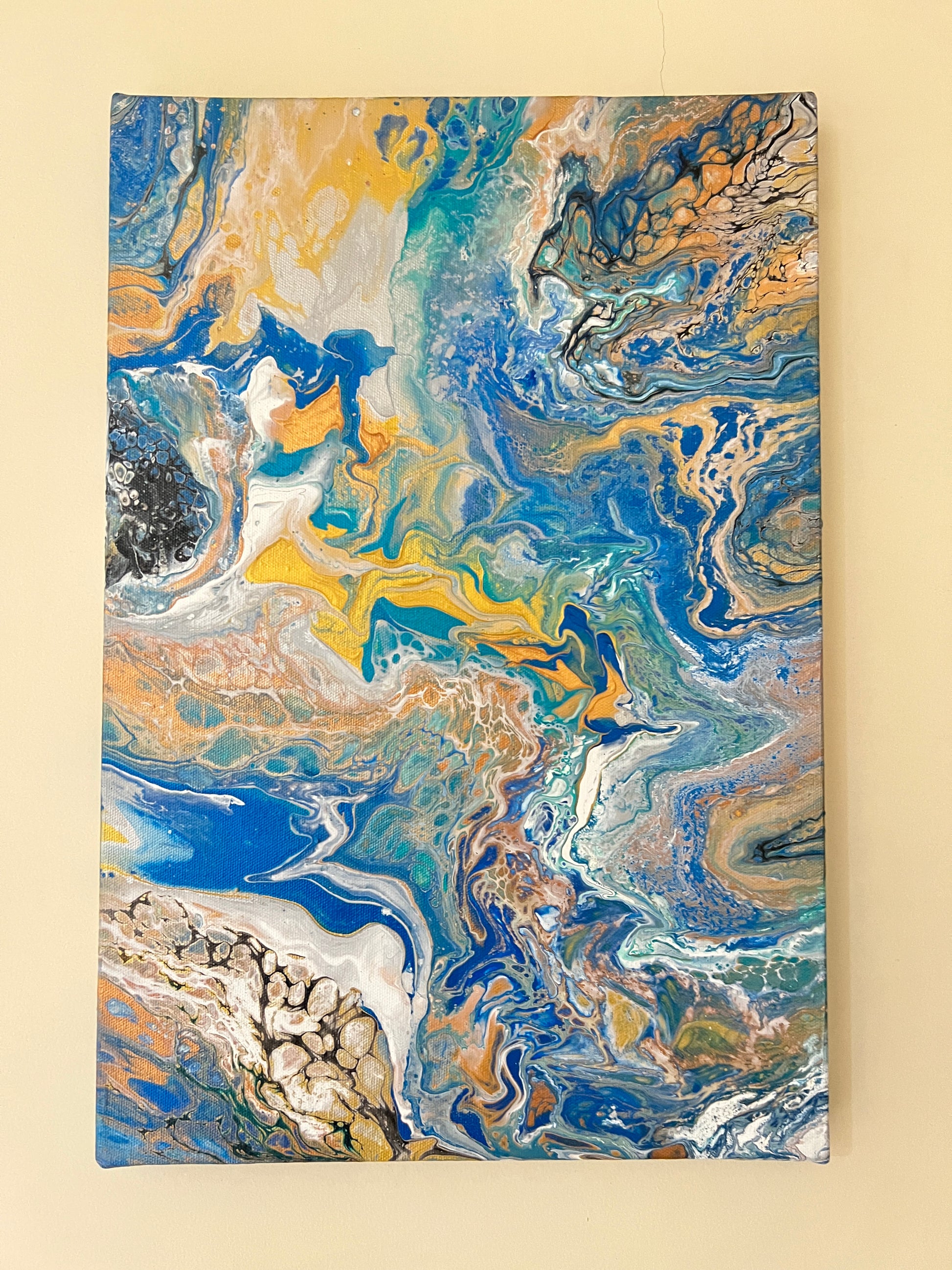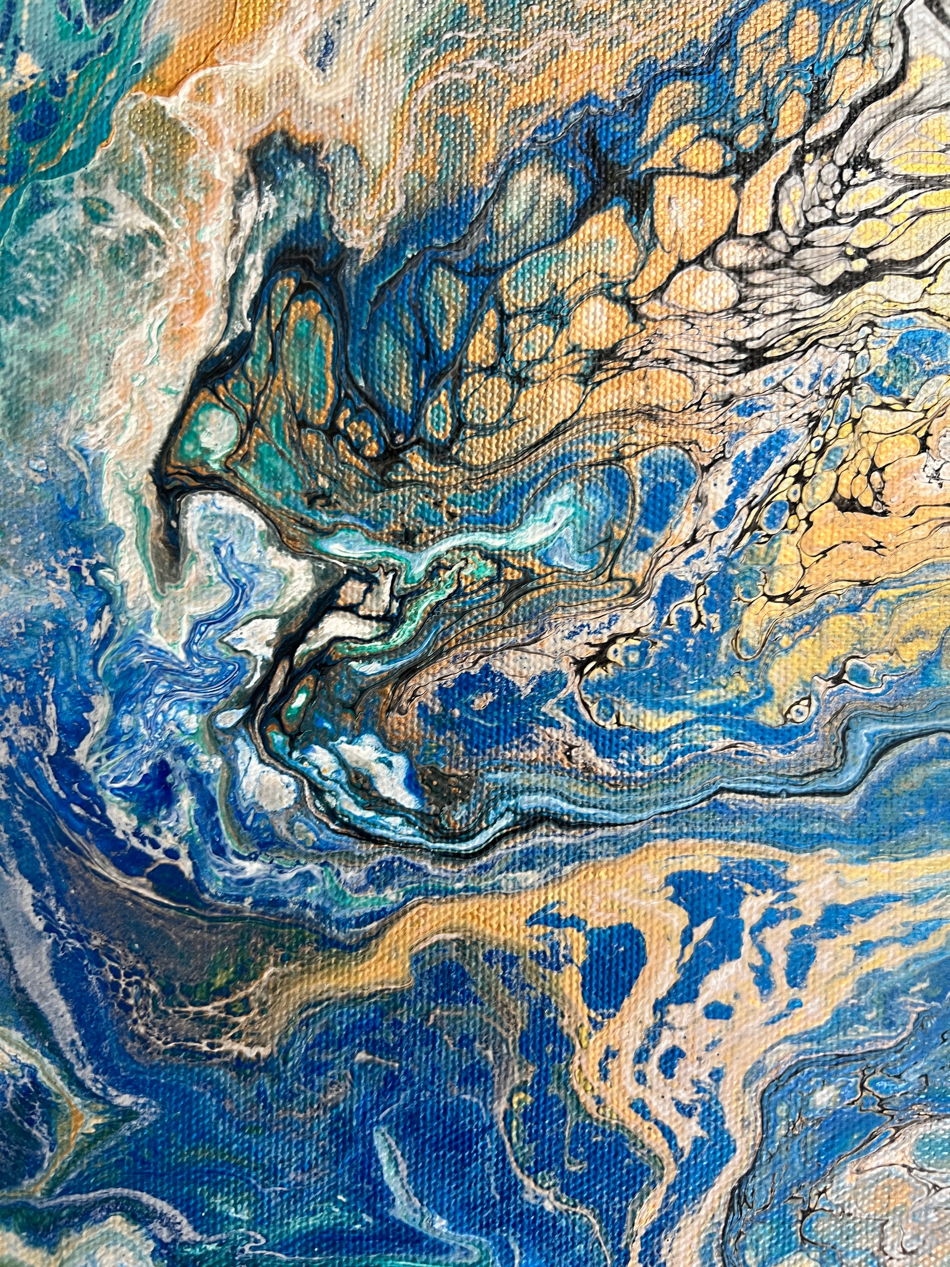 Immerse yourself in the captivating movement of "Ebb and Flow," a fluid art masterpiece that echoes the rhythmic dance of ocean currents. Swirling shades of azure, turquoise, and gold intertwine with earthy browns and soft whites, creating a mesmerizing landscape that evokes both tranquility and energy. The intricate patterns and delicate lacing add depth and texture, inviting the viewer to explore the endless interpretations within its abstract beauty. Perfect for bringing a sense of calm sophistication to any space, this artwork is a testament to the harmony of color and motion.