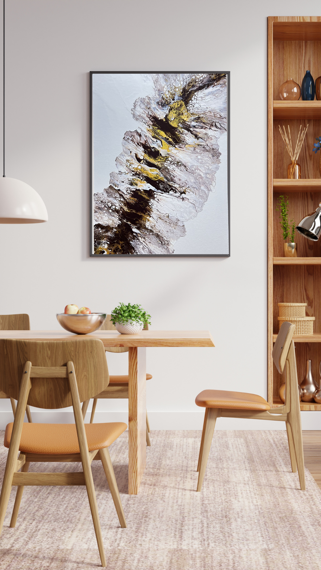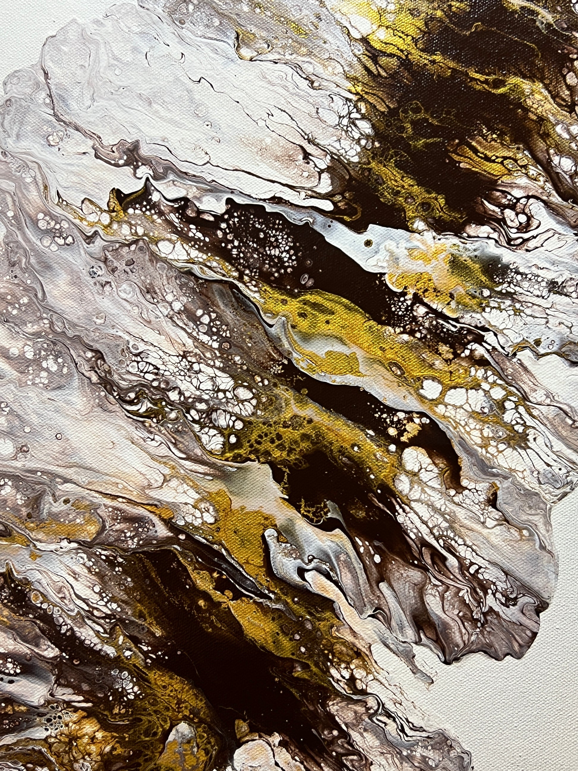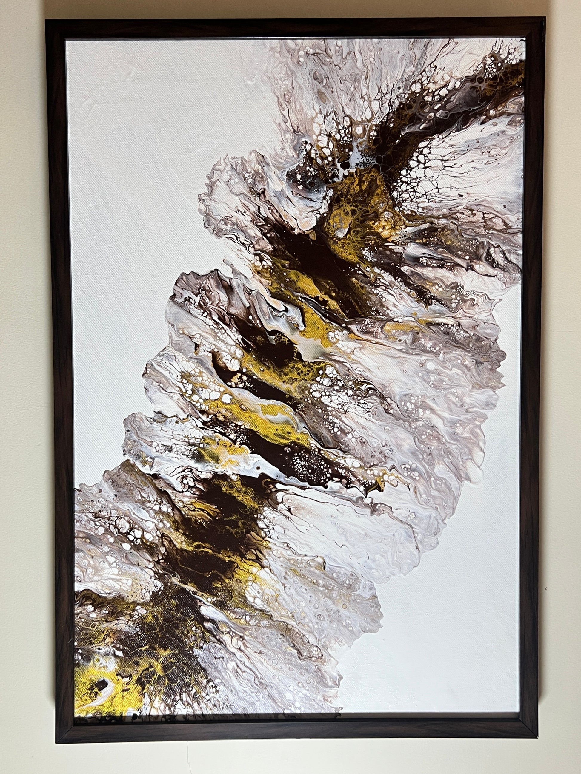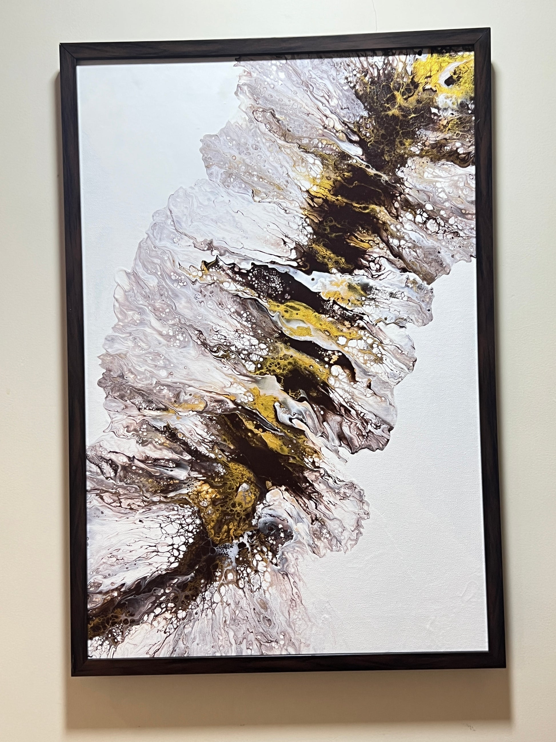 This painting features an abstract fluid art composition with a striking interplay of colors and textures. Swirling tones of brown, gold, and white create a dynamic movement across the canvas, resembling the natural patterns found in minerals or flowing water. The use of metallic gold adds a sense of luxury and depth, while the white background allows the earthy hues to stand out. The intricate cells and organic forms evoke a sense of spontaneity and freedom, making this piece a captivating focal point. Perfect for modern and contemporary interiors, it invites viewers to interpret their own emotions and reflections. This abstract fluid art painting is elegantly framed in brown, enhancing its earthy tones. The varnished finish gives it a glossy, polished look while ensuring durability and easy maintenance. Its intricate swirls of brown, gold, and white create a dynamic, nature-inspired design, making it a striking addition to any modern or contemporary space.