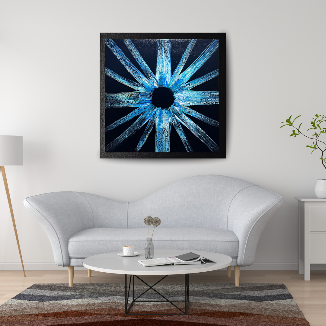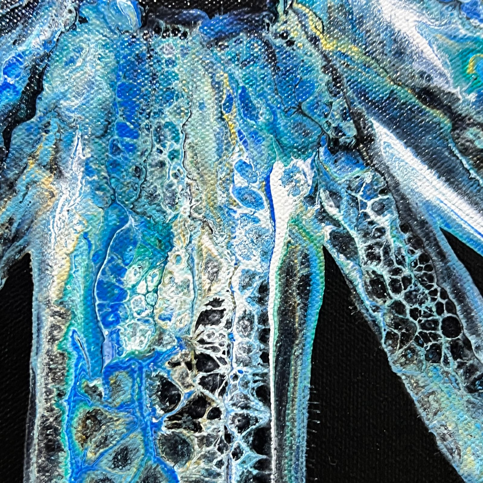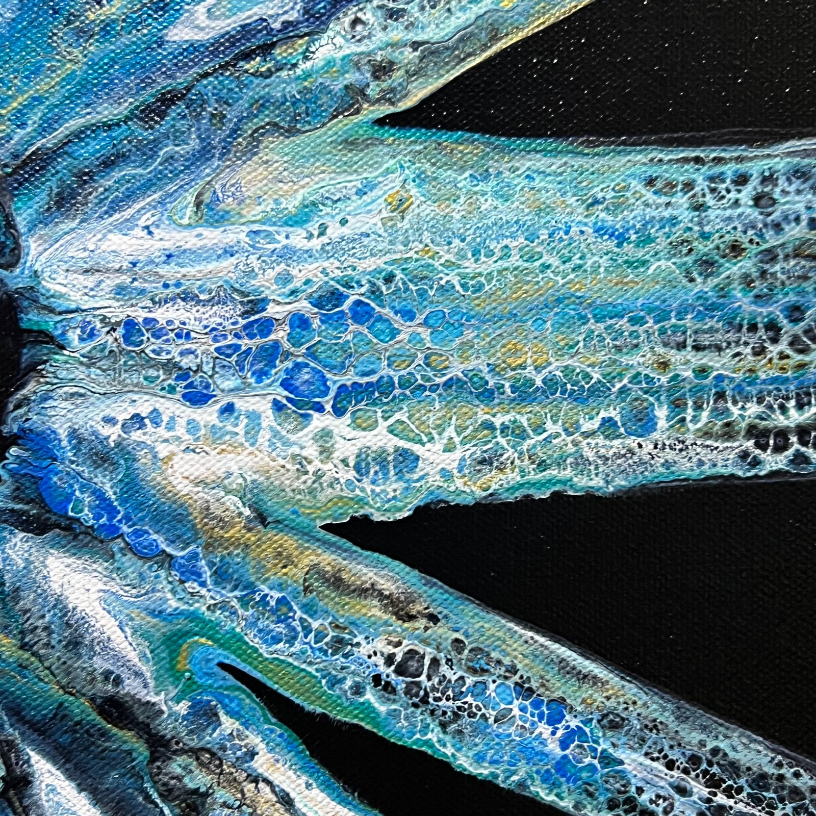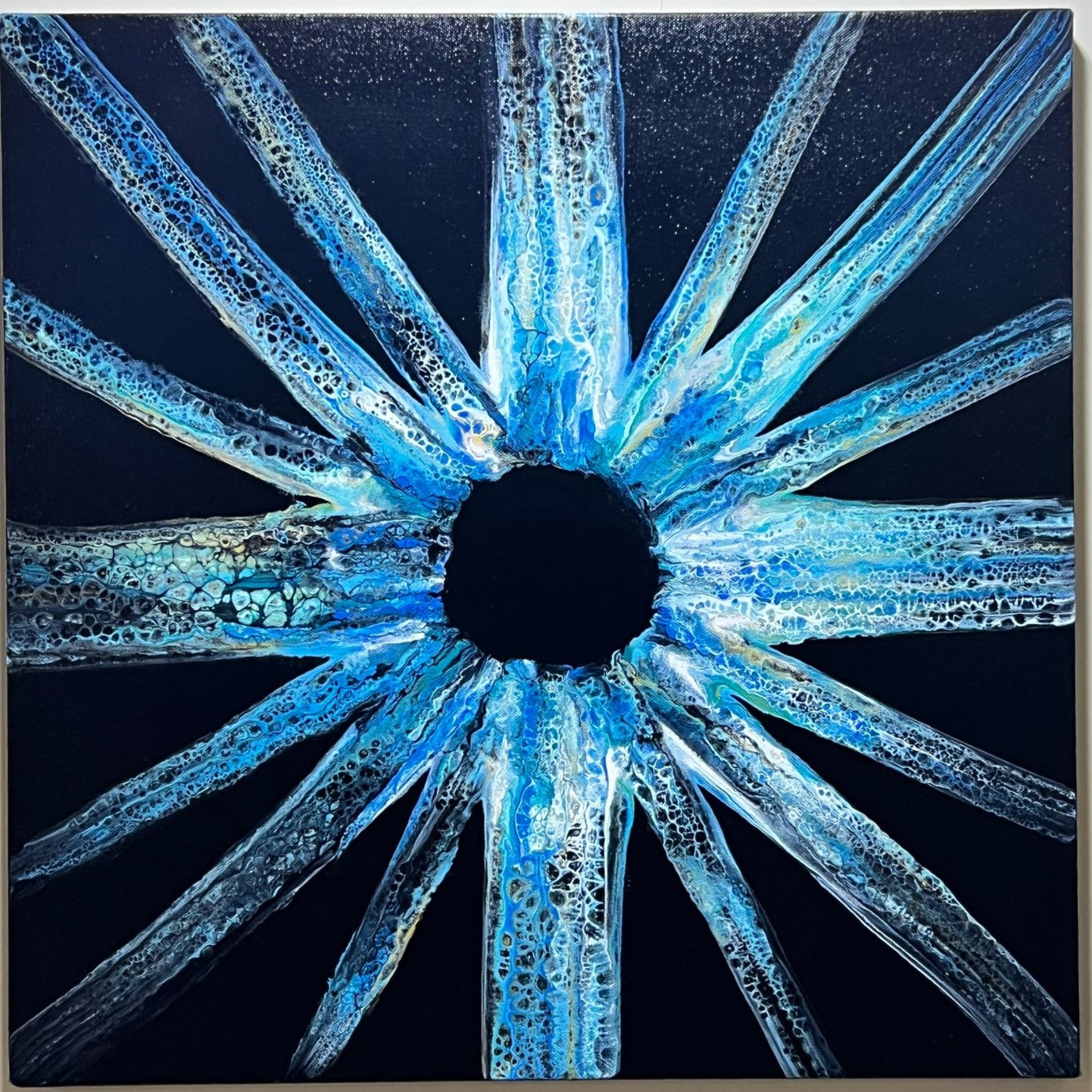 This acrylic fluid art piece captivates with its bold interplay of blues and whites, radiating from a deep black center. The organic flow of paint forms intricate cells and delicate patterns, evoking the beauty of natural forces in motion. the fluidity and depth of the colors take center stage, offering a sense of energy and movement. This artwork is a testament to the unpredictable and mesmerizing nature of fluid art.