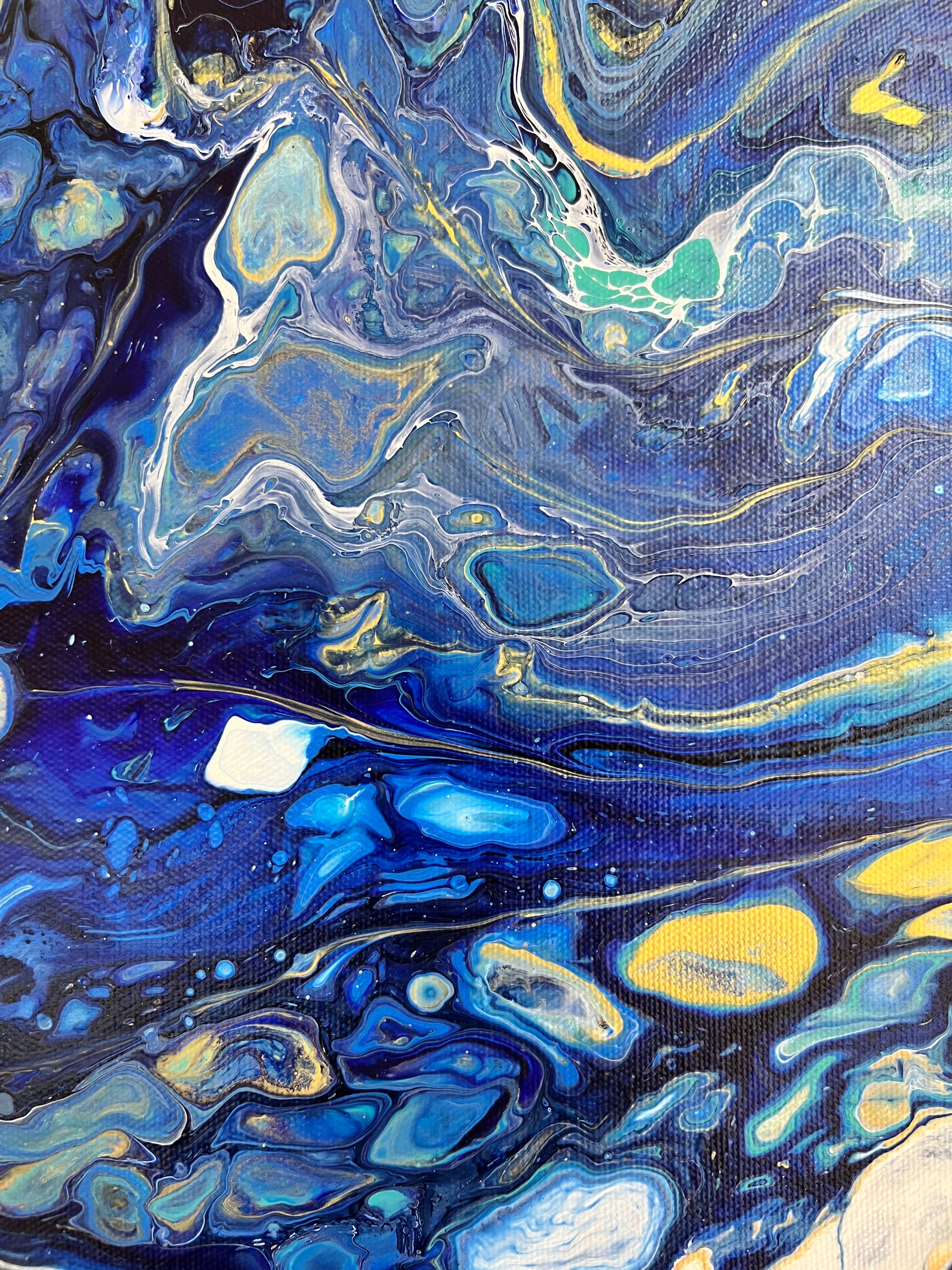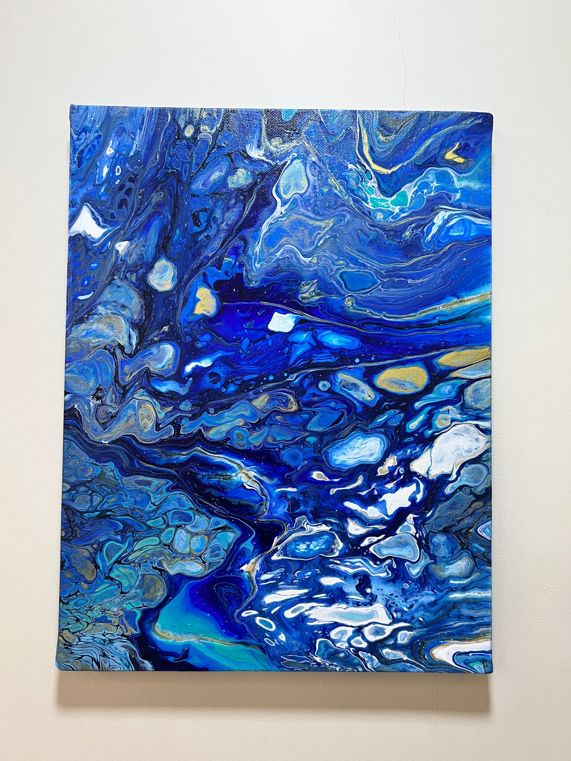 Drawing inspiration from Van Gogh's iconic swirling skies, "Starry Depths" captures the essence of a celestial night brought to life through fluid art. Rich blues cascade across the canvas, accented by touches of gold and white that evoke the shimmering stars and glowing moonlight. The organic movement of the paint, with its intricate lacing and bold contrasts, mirrors the dynamic energy of the night sky. This contemporary interpretation brings a sense of wonder and infinite possibility, making it a perfect statement piece for any art lover's space.