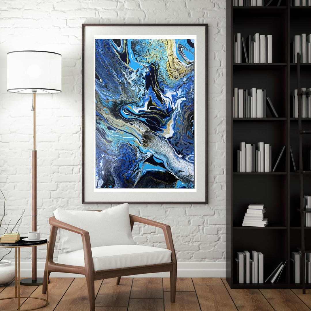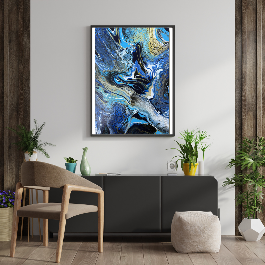 Rivers of blue, gold, black, and ivory ebb and flow like ancient currents carving stories across the canvas. This piece captures the movement of time as a living entity—fluid, ungraspable, and ever-shifting. The interplay of deep ocean hues with shimmering veins evokes both the timeless power of nature and the mysteries of memory.